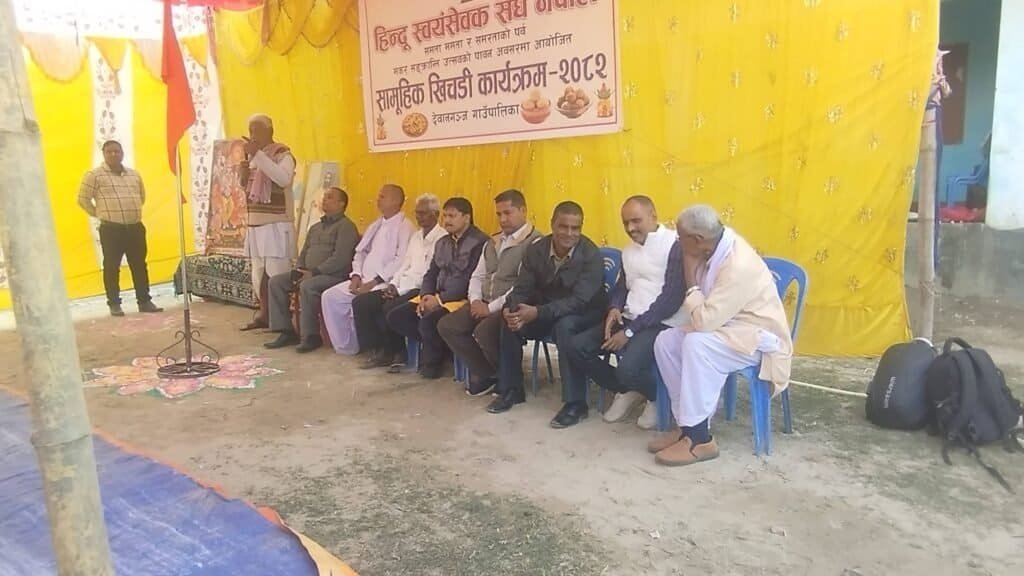 हिन्दू स्वयंसेवक संघ नेपाल, कोशी संभागले सुनसरी देवानगञ्ज गाउँपालिका वार्ड नं ६ को राजाजी डिहीबार थान मन्दिर अगाडि आयोजना गरेको समता, ममता र समरता भन्ने मूलमन्त्रअनुसारको मकर संक्रान्ति पर्वमा समुदायले उल्लासका साथ सहभागिता जनायो। पावन अवसरमा आयोजित सामूहिक खिचडी कार्यक्रमले परम्परा र समुदायिक एकतालाई जीवित राख्न महत्त्वपूर्ण भूमिका खेलेको छ र कार्यक्रममा स्थानिय महिला, पुरुष तथा बालबालिकाको उत्साहले वातावरण थप धन्य बनायो।